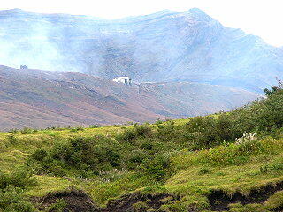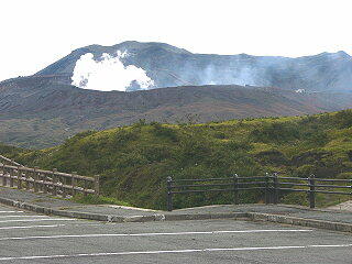 草千里から阿蘇山を望む 火口近くにはコンクリートの避難小屋がある