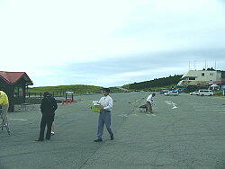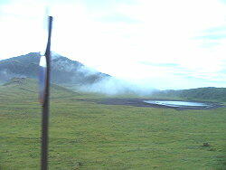 草千里の駐車場。奥で牛の糞を片づけている。 池がありました