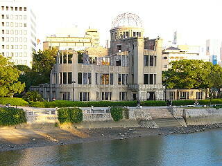 原爆慰霊碑と資料館 原爆慰霊碑から原爆ドームを望む