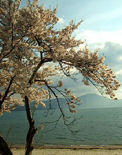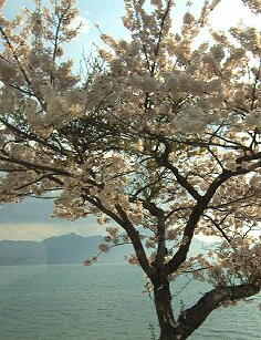昨年もこの近くに泊まりました 湖畔にある神社の桜が満開状態