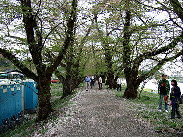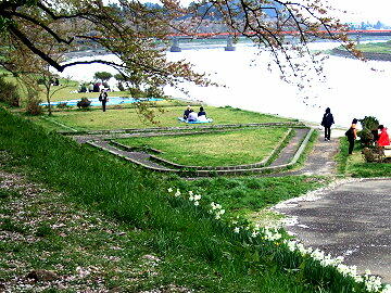2キロも続く桧木内川堤のソメイヨシノ 葉桜の中、河原で花見をしているグループ