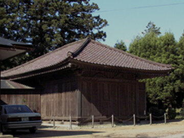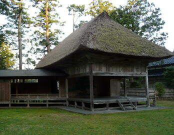 この神社の能舞台は、弘化3年(1846)に再建されたもので、本舞台(寄棟造、茅葺き)、後座(あとざ)、地謡(じうたい) 座、橋掛り、裏通路などがあります。残された記録から、能が演じられたのは文政6年(1823)以降であることが分かりま す。 現在は、真野能楽倶楽部が主体になって、毎年4月に定例能が行われています。また、真野地区には佐渡鷺流狂 言(さぎりゅうきょうげん)も伝えられていて、能とセットで上演できます。