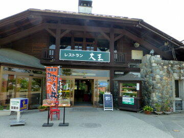 売店で名物のわさびソフトクリームがあったので、食べてみたら確かにわさびの味がしまた。なお、この農場の「大 王」という名は敷地内にある大王神社に由来したもので、この神社は民話に登場する八面大王の胴体が埋葬されている という。