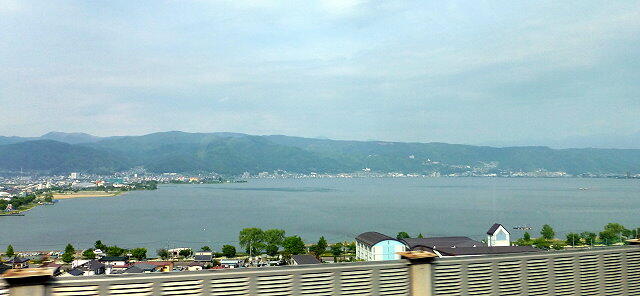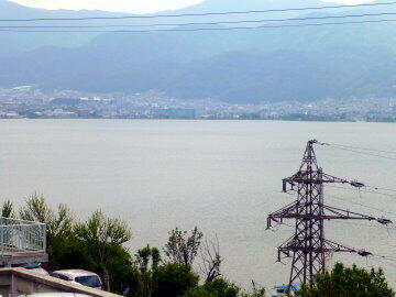 諏訪湖全景。諏訪湖は岡谷市、諏訪市、下諏訪町に三分割されています。