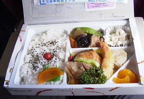 機内でスタッフ御用達の弁当を開く 他のお客さんはなぜくれないのだろうと・・・・?