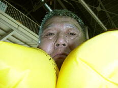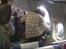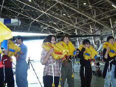 みんなで救命具を付け膨らましました。機長は幼児用を着用しようとしたがやはり駄目。苦しーい首が絞まる。