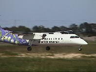 オホーツク紋別空港へ到着して、何とか駐車場へもぐり込めたが、いざエプロンに入って見物場所を確保しようとしたら、入場はセキュリティの関係で一般の見物客は入場禁止ということである。この日は模型飛行機大会もあり、その参加者達も警官の前でチェック 空港全体 丘珠からのDHC-8の着陸 を受けて入場する。ピーピー鳴るたびに身体検査を 受けるという厳重さである。