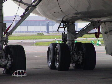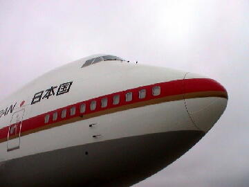 ジャンボは近くで見るとさすがにデカーイ。さすがジャンボ。コクピットを下から見上げるとビルの3階くらいの ところにある感じである。(右)パイロットはまだ接地しないかなと思ったらすでに着いていたりして・・・・ (ジャンボという名は初めボーイング社では嫌がっていたらしい。鈍重な意味にとられた?) 当初ロッキード社のC5ギャラクシーに破れたが、航空会社の後押しもあり、民間機仕様で売り出したら 大当たり。試作機の名残は貨物室ドアを機首に設置するため、コクピットが高い位置にあります。 現在の民間機の747貨物機が本来の姿でしょう。