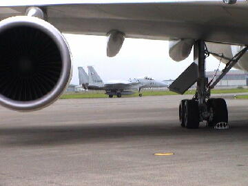 さすが300トン以上を支えるメインギアはゴッツイものです。 バックにこのジャンボを格納するハンガーが写っています。(左) エンジンもでかい。中に人が立っても余裕。エンジンとメインギアの間にタクシー中のF15。(右)