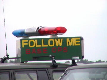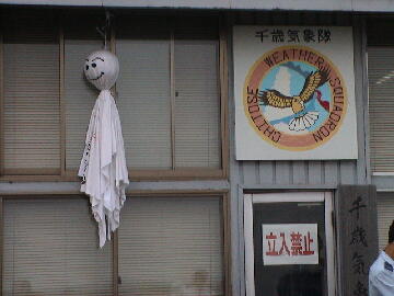 米軍機用フォロミーカー(航空機の誘導車)。ランプも青赤の米国仕様(左) 気象隊には大きなテルテル坊主。残念ながら願いは空しく悪天候(右)