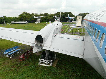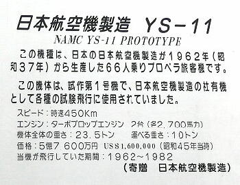 屋外展示機の中で一番目を引くのはやはりYS−11である。戦後の国産機第1号の機体で記念すべき試作機である。 販売がうまくいけばこの後、次々と新しい機が生まれたと思うが、この販売失敗で現在優秀な技術を持ちなから世界の 航空機メーカーの下請けに甘えているのは残念でたまらない。