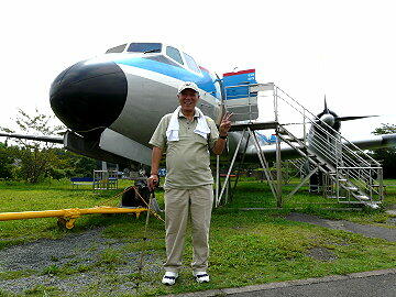 どこかに案内板がないかと見渡すがそれも無し。店屋が一軒あったので、そこへ行くが人がいる気配もない。暑さと焦 りでドーッと汗が噴き出してきた。方角がわからないまま佇んでいると、来ました!、今まさに着陸する航空機が見えたの ではないか。これで滑走路の方角がわかったので、その方角へテクテクと歩き始める。その道路は沢になっていて下り 坂が延々と続き、今度は逆に上るという、身障者にはこたえる道のりであった。一番下がった所に航空科学博物館の看 板があって一安心。バス停から博物館まで優に600メートルくらい歩かされた感じである。