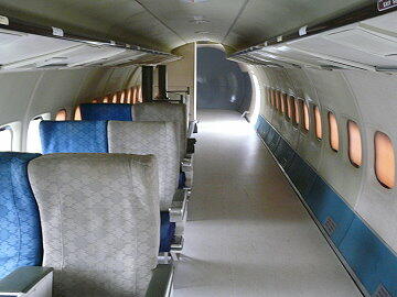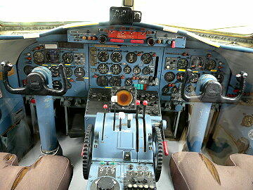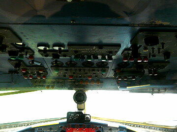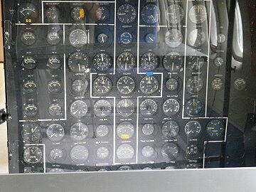 客室にエンジン関係の計器がズラリ 客室からコクピットを望む
