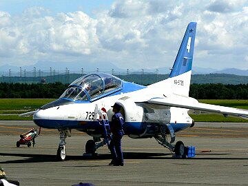 ブルーインパルス用T−4中等練習機。 航空自衛隊のほとんどの基地に配備されていている。 非常に機動性がよく、かつ安価なため、かなり完成度の高い中等練習機といわれています。