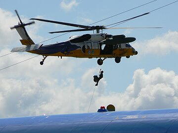 ヘリからのラペリング降下デモ