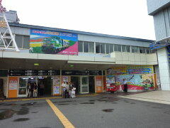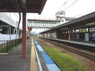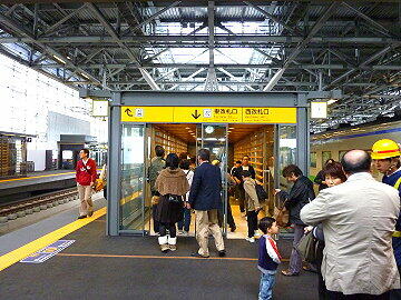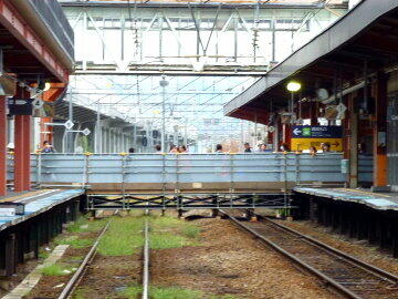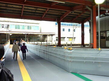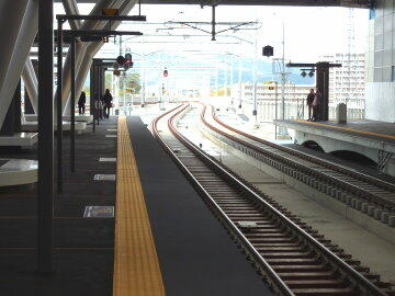 ホーム幅は広くも狭くもなく、ちょうどよい広さである。長さは駅舎をはみ出すくらいあり、長大列車が停車しても十分な 長さがあるように思えた。ローカル線は1,2両編成なのであの長いホームのどの辺に停車するのか、待つところがわ からなく、ウロチョロするのがシャクである。いずれLCDの表示板に表示されると思うが、現在、停止位置のLCD表示 板は真っ暗のままであった。乗車位置を示す札をホームにぶら下げるより、すっきりとした感じである。