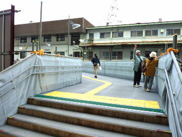 新駅舎までの仮通路は東西に1本ずつ設置されました。旧駅舎の取り壊しが終了するまでこの体制をとるのかは不 明であるが、いずれは線路、ホームの撤去に伴い、ルートは何回か変更されるに違いない。
