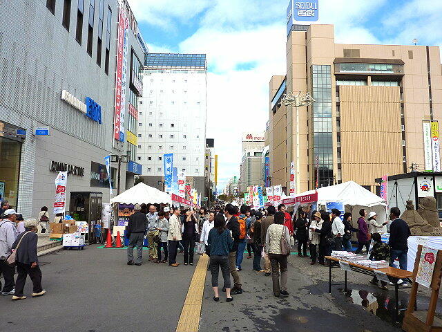 平和通りはちょうど「食べマルシェ」開催中で駅前広場までテント村が続いていました。