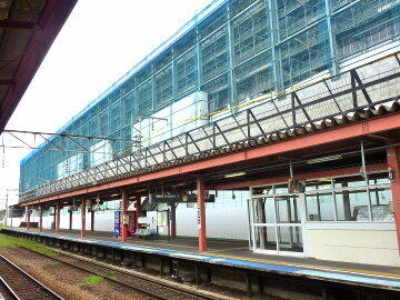 8時間あまりで新駅までの仮通路を東西2カ所に設置しました。 外装工事は来年完成予定。全面ガラス張りの明るい駅舎になりそうです。