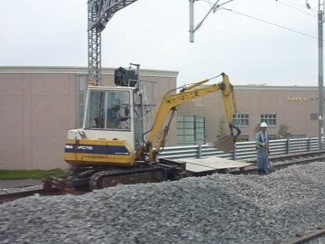線路上で作業している特殊ユンボ。このユンボは軌道も走れるという「軌陸車」