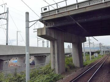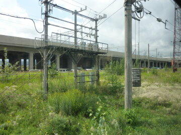 新旧の線路が並んでいます 旧線にまたがっている架線柱はどうなるかな