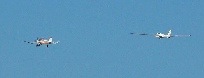 ロバン DR400/180R がルモルケグライダー MDM-1FOX を曳航して高度を上げていきます。 (滝川スカイスポーツ振興協会)