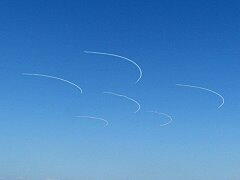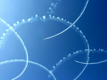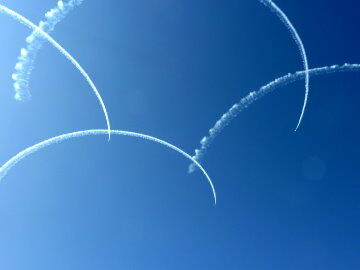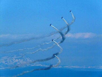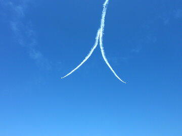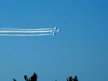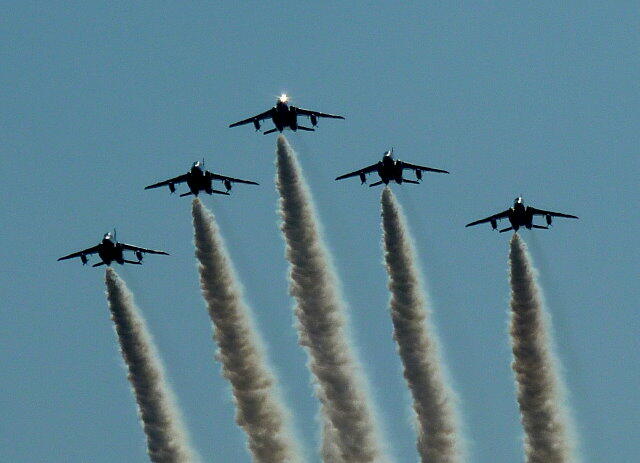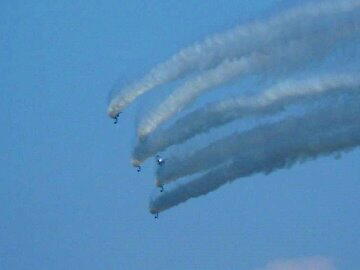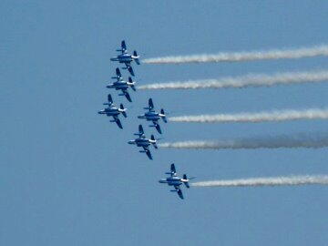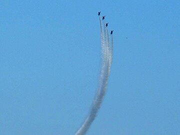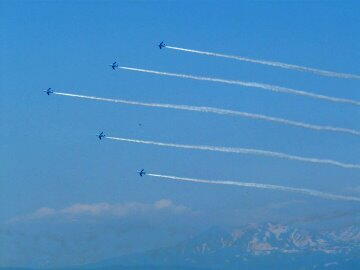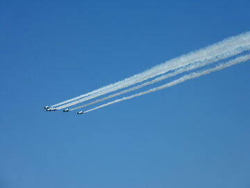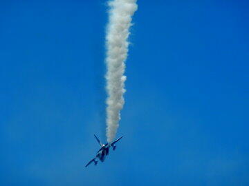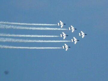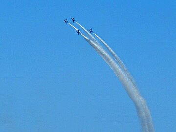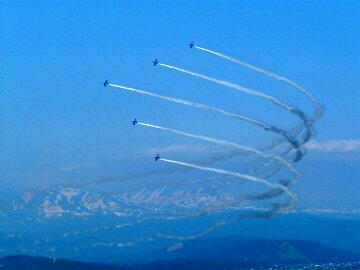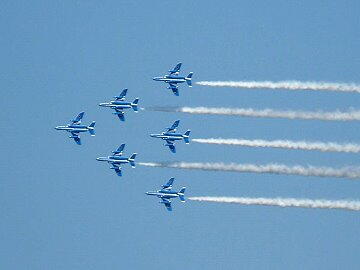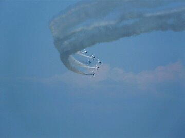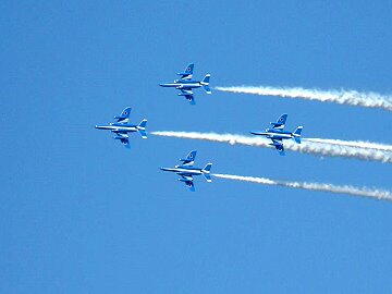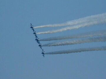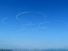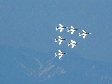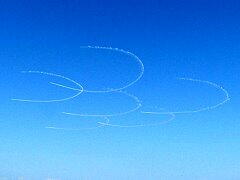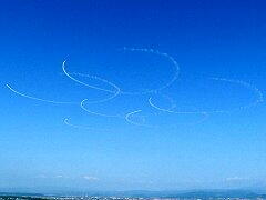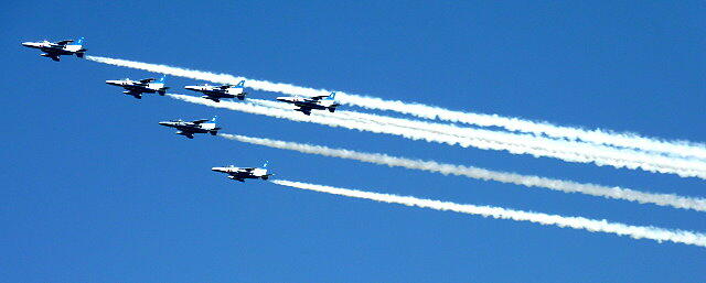 ルーズな隊形から次第にデルタフォーメーションを組み始め、隊形が整ったらスモークを出しながら180度タ ーンを行います。