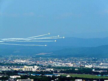 2010年6月12日 2010ブルーインパルス旭川旭川 道北では2回目となるブルーインパルスの展示飛行が披露された。これは13日に開催される陸自第2師団60周 年・旭川駐屯地58周年の創立記念行事の一環として旭川駐屯地を中心に実施された。