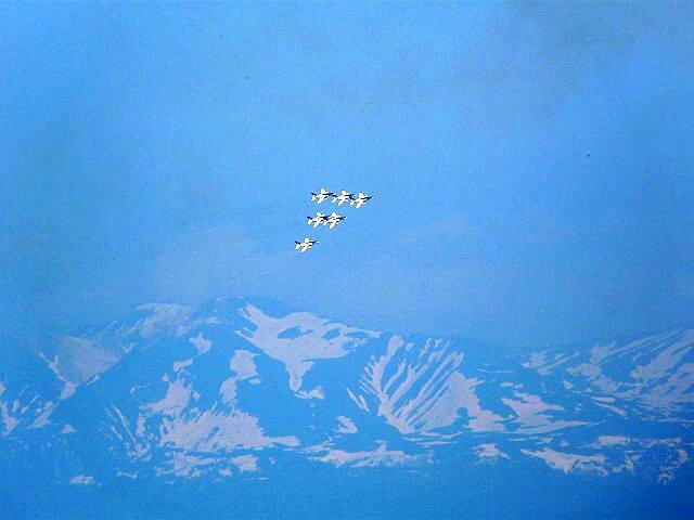 当初はその隊形で飛行場を一度パスするのかと思ったが、すぐに編隊を崩して最初の機動(演技)に入った。彼らは 今朝、松島基地を発進し、一旦、千歳基地に着陸。その後、千歳リモートで石狩川沿いに旭川駐屯地へ飛来したと思わ れる。