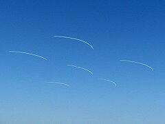 我々は駐屯地に隣接するスーパーの屋上に陣取り、14:50から行われる予行を自動車の中で待つこと40分、南西 の方角から定刻通りブルーインパルスの編隊が見え始めました。トレール隊形で一斉にランプを点灯したので位置がす ぐに判明した。恐らくRJCAへ到着したことを知らせたのではないかと勝手に想像。