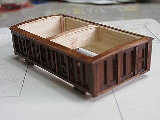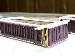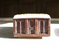 船室の壁ができたので早速オイルステインで染めたが、これが大失敗。今までラッカー系の塗料しか扱ったことがな いということが災いして、ものの見事にマダラに染めてしまった。この工程が終わらないと屋根ができないので練習のつ もりで最後まで制作してみた。マダラになった原因は材質が異なると染まり方も異なるということ。糊が付いていると染ま らないことがわかった。そこでラッカーで塗ることにしたが当地ではあまり種類がなく、チョコレート色に少しの白色を混ぜ て塗り上げた。結果はご覧の通りの見るも無惨な船室となった。