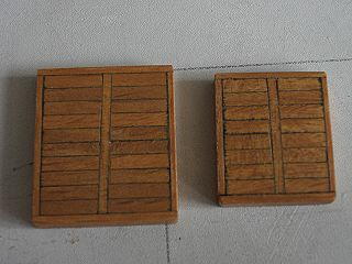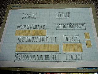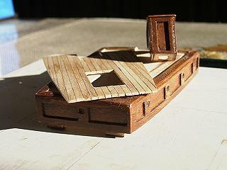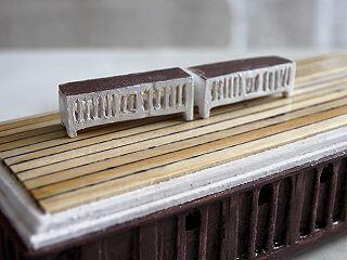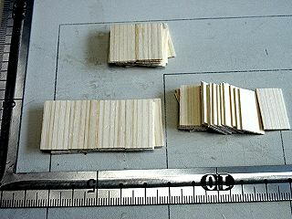 屋根の構造はよくわからないが、あらかじめ白色で着色した条板2段重ねで周りを囲み、その上に船室用の条板を 貼り付け、厚さを調整した。黒い筋はこれから始める甲板材のつもりで練習してみた。条板の片方にマジックでこすって 貼り付けるといい具合になった。