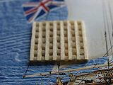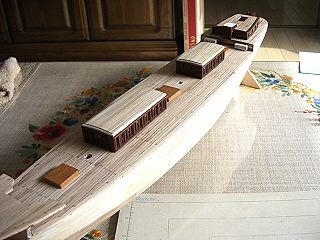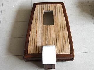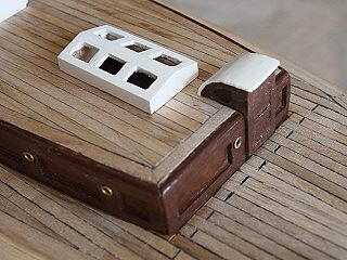 船尾の船室明かり取りと思われる天窓は未だに材料が配布されない。そこで2ミリの檜材で自作することにした。いず れ蓋をする予定。しかし天窓の位置はキットのままだと少し後に寄り過ぎる感じがするのだか・・・。