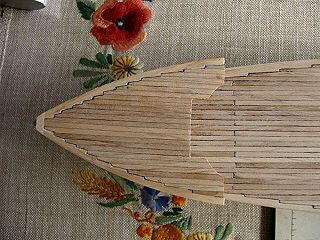 船首部分と主甲板の条板張りが終了。 条板の縁は177ページの写真とロープ展示会の作り方を参考にした。 しかし、この細工には相当な時間を費やした。 船室の穴は将来バラストを入れるためにあける。