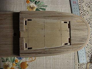 落として接着したため、内側に補強材を入れた。ベニヤより薄いので船室には梁を渡す予定。