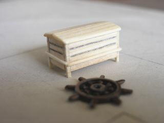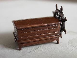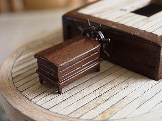 キットの操舵装置では納得できないので舵輪を基準にして176ページの写真を 参考に自作した。これに(CUTTY SARK)という銘板をはめられればよいのだが・・ 何しろ20ミリ×10ミリの箱であるから書けないかも知れないが、挑戦する価値はある。 この箱の材料は折箱に使用されるエゾマツで、チョッと柔らかすぎの部材である。