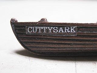 帆船模型の掲示板を参考にボートと操舵装置に「CUTTY SARK」の文字を入れてみた。最初はどのようにして文 字を書こうかと思案していたが、とてもじゃないがあの大きさの文字を書く自信がなかった。