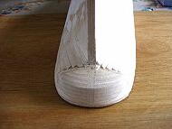 キールは木工ボンドで固定したが、どうも心許ないので、船首部分、キールに4カ所の穴を開けて、木ネジで固定した。これでそう簡単には外れることはない。