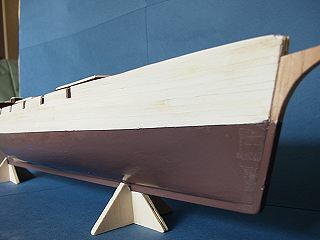 下地がしっかりしているので、今回パテを塗る必要がなかった。このままでも銅板と黒色を塗れば船体の外側は完成 と思うのだが・・・。右写真のブルワークの影を見るとわかるが、若干のシアーラインをつけてみた。甲板の中央部をこれ 以上削ると下地が出るので、このくらいで我慢した。本来、フレームを組む段階でキチンと調整しておかなかったツケが 今になって影響が出てきている。