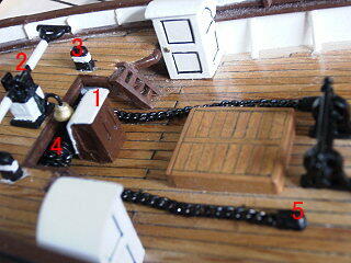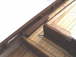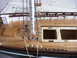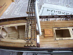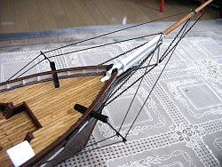 ミズンマストの留め板は直接甲板に貼り付けるようになっているが、それであれば直接甲板に穴を開ければ解決する のにと思うが、写真を見ると留め板はあるらしい。