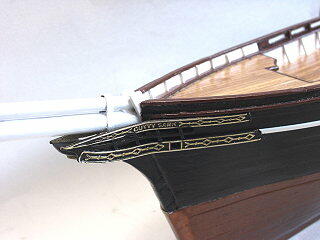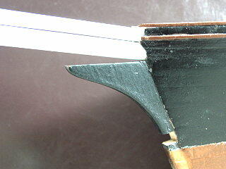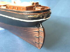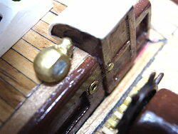 これで船首部分を固定したが船首像がうまくセットできるか神のみぞ知るという感じである。船首飾りは一度黒色で塗 りつぶし、その後、凸部分を磨いて残りを船体色と同じにした。とにかくカットアンドトライの連続で想像力をたくましくして 自分流で制作していくのは実に楽しい。