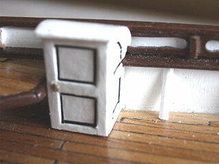 今回はバウスブリットの残りと船首周りを制作した。とにかく船体の小物を作らないとマストも作る気にもならない。トイ レは白一色では何か間抜けの感じがしたので黒線とドアノブをを入れてみた。線はとうてい書けないのでテープを細く切 って貼り付けた。