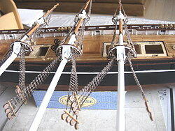 これからは各マストを船体に固定してロワーマストのシュラウドとラッ トリンの始末をしなければならない。 しかし、マストを固定すると取り回しが大変なので、固定しいないでロワーマストのラットリンを張ることができないか現在思案中である。
