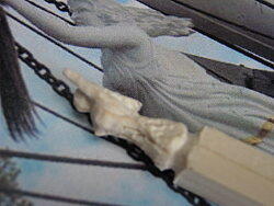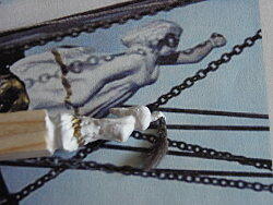 船首部分に鎖とロープを張る。キットとは配置が違うが、本誌の写真を参考にして設置。船首像はキットでは何故か扁 平であるので、船首像は自作のものを利用。しかし、キットとは違い顔がのっぺりしているのは我慢のしどころか。