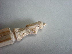 またまた大改造である。バウスブリットを受ける船首部分をカサ上げした。現状のままではバウスブリットとの間隔が 開きすぎて船首飾りもおかしな角度で貼り付けることになる。本来は船首像が来てからと思ったが、いずれにしても改造 しなければならないので、切り落とししてしまった。道具は以前、DIYから工作用の薄いノコを購入していたので、きれい に切り落すことができた。まるでナイフで切り落としたようになる。カサ上げした下の部分には木片を入れて整形する予 定。