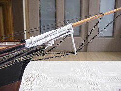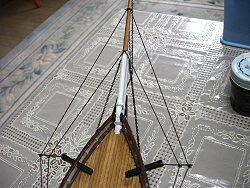 帆船模型で一番手間のかかるロープ張り作業に着手。キットではロワーマストからシュラウドを組んでいくようになって いるが、それではマストを固定しなければならないし、固定したマストでロープワークをするのは大変である。そこでロワ ーマストのロープ張りは一番最後にしてトップマスト、トップゲルンマストの方から制作することにした。