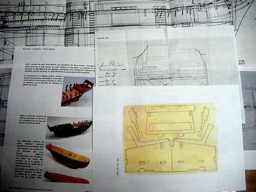 まず、そのためには詳細な設計図をいかに手に入れるかですが、田舎村氏のHPにいろいろな資料が集約されてい たり、カティサークで知り合った方から詳細な資料を送って頂いたりした。、これを参考に早速、木型の型取り制作に入. ことにした。