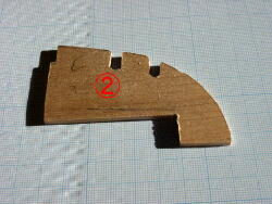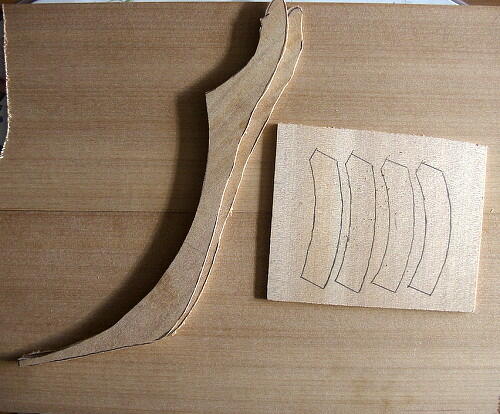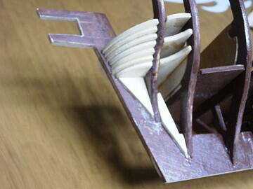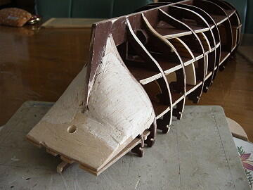 船首部分の補強リブと船首の突き出し部分。 板の厚さが3ミリなので2枚を貼り合わせる予定。貼り合わせが終了したらヤスリで仕上げます。