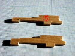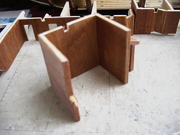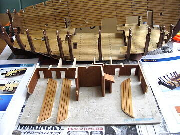 船室や仕切壁はブロックごとに完成させて、組み込むというのがゴマフ風の組み立て方法である。こうすると同じ作業 が一気に出来るので時間のロスがない。ニスは木目を生かすため透明のニスを使用している。