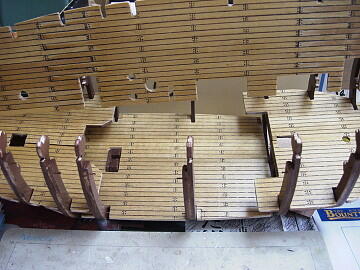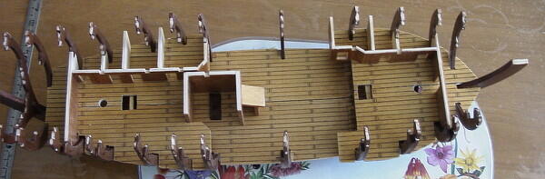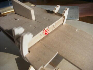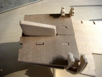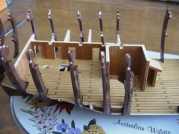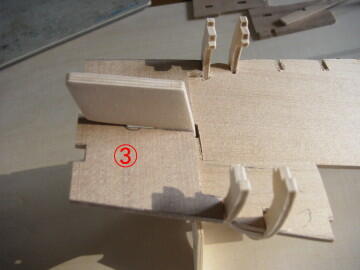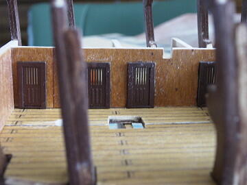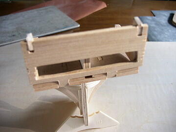 船尾梁の底板を上から見る。 船尾船室の架台に支柱を嵌める。